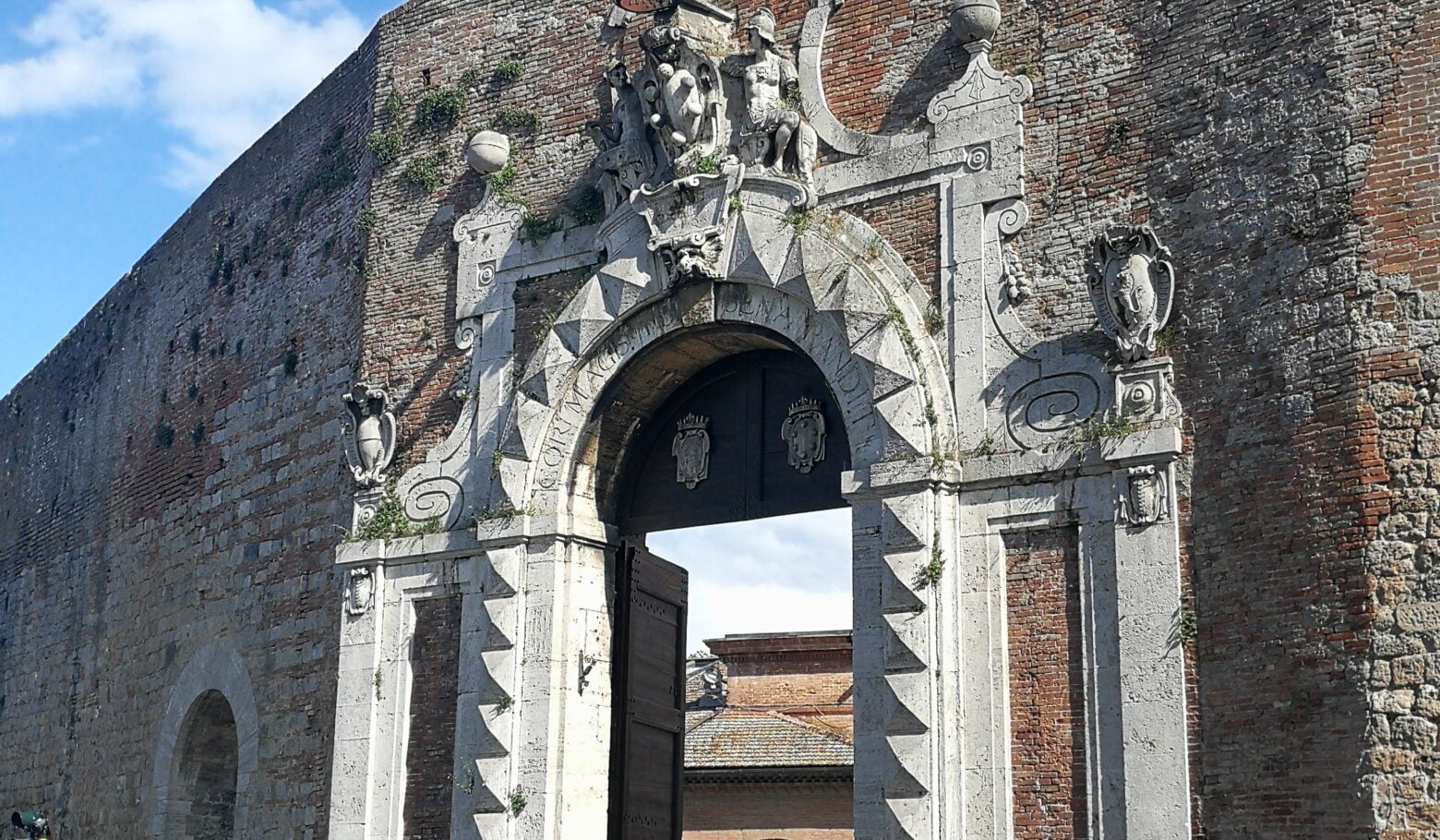 Le porte di accesso alla città : Porta Romana Nella parte Sud di Siena affacciata sulla via Cassia troviamo Porta Romana (detta anche Porta Nuova) una delle più importanti porte di accesso alla città. Fu innalzata nel 1327-1328 su disegno degli architetti Giovanni d’Agostino e Agnolo di Ventura, munita di merli e di un antemurale